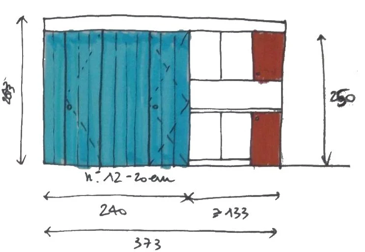 Réalisation d’un bloc des services, cuisine, salle de bain (avec douche, lave-mains et wc) et rangements.